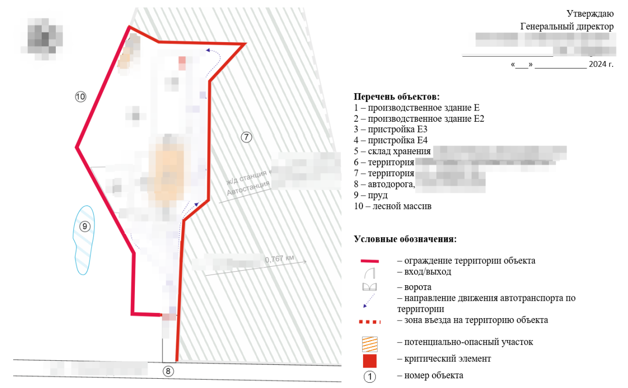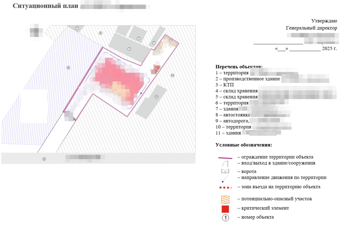 Ситуационный план объекта: топографическая карта местности с привязкой самого объекта в двух масштабах, план территории объекта и поэтажные планы помещений с отмеченными критическими элементами и потенциально опасными участками.