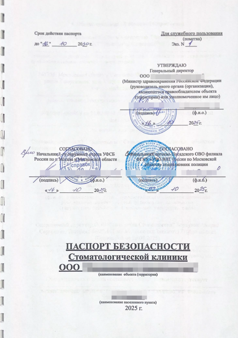 Паспорта для сети стоматологических поликлиник согласованы без замечаний в УФСБ России по г. Москва и Московской области, а также в филиале ФГКУ «УВО ВНГ России по Московской области».