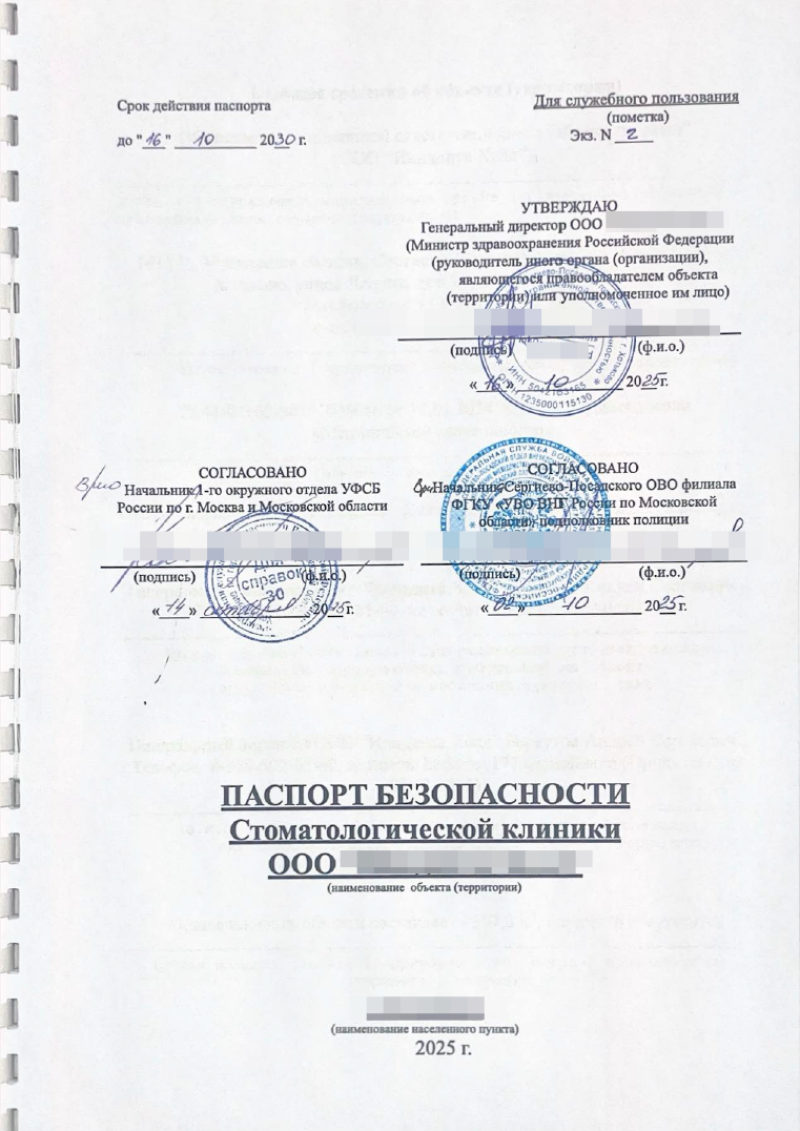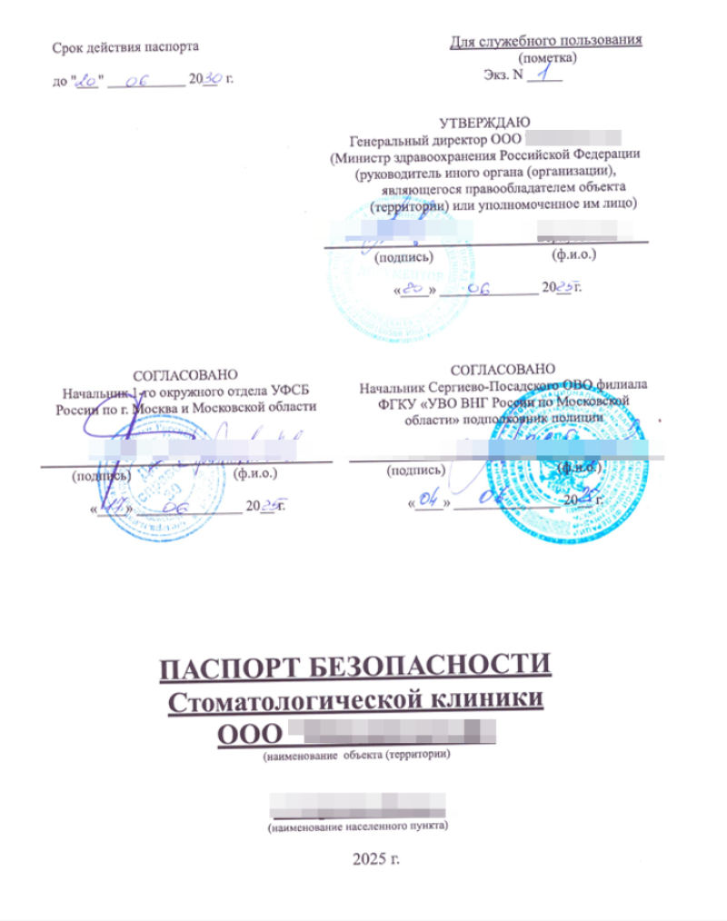 Разработка и согласование паспортов безопасности объектов (стоматологических поликлиник) в соответствии с требованиями Постановления Правительства РФ от 13.01.2017 № 8 (для объектов здравоохранения) и с учетом особенностей размещения в жилых зданиях.