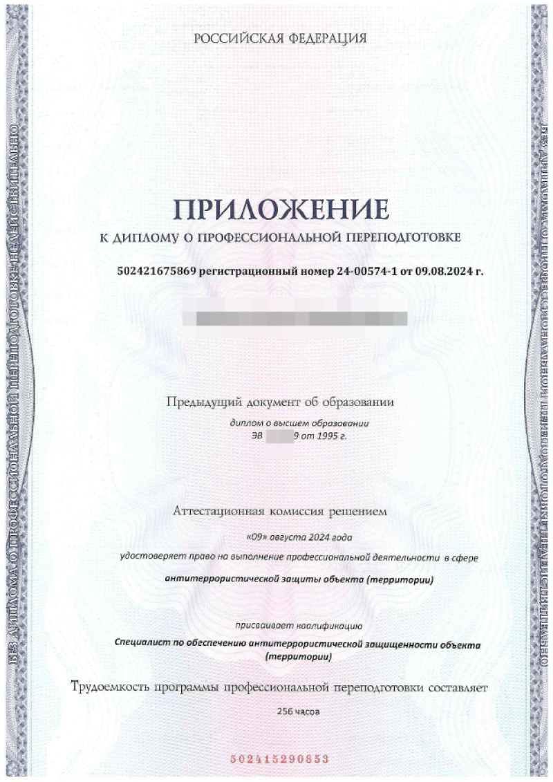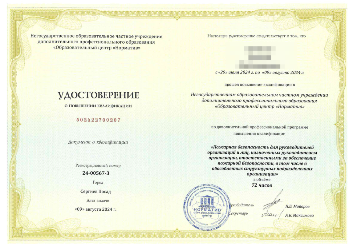 Обучение ответственного лица. Мы провели обучение по программе профессиональной переподготовки "Специалист по обеспечению антитеррористической защищенности объекта (территории)" и повышения квалификации по программе "Пожарная безопасность для руководителей организации и лиц, назначенных ответственными за обеспечение пожарной безопасности". Документы об обучении предоставили согласующим органам.