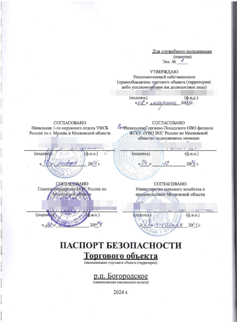Разработка и согласование паспорта безопасности в соответствии с Постановлением Правительства Российской Федерации от 19.10.2017 № 1273 "Об утверждении требований к антитеррористической защищенности торговых объектов (территорий) и формы паспорта безопасности торгового объекта (территории)"