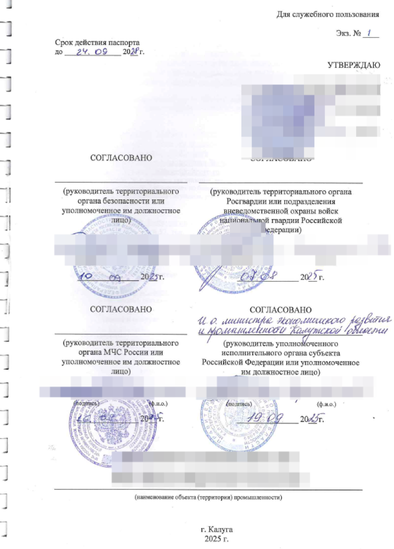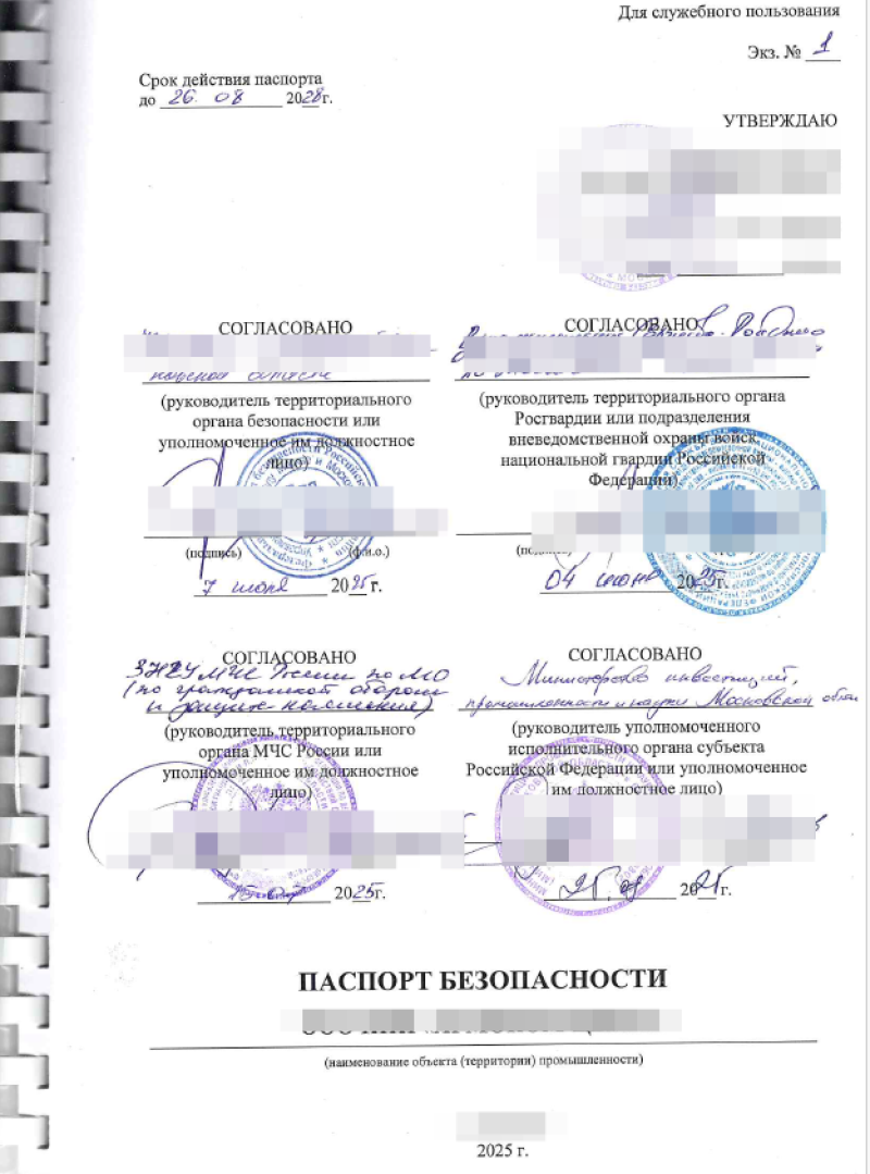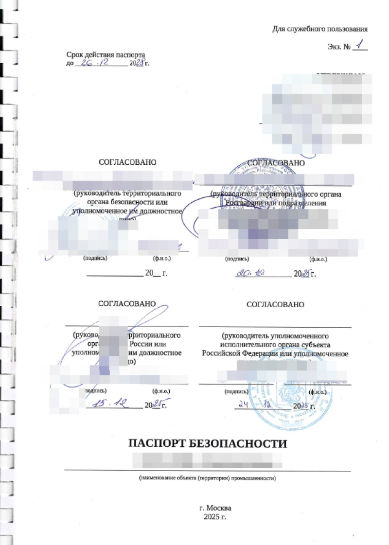 Паспорт безопасности составляется в 5-ти экземплярах, согласовывается с Росгвардией, ФСБ, МЧС, уполномоченным исполнительным органом субъекта Российской Федерации по месту нахождения объекта промышленности.