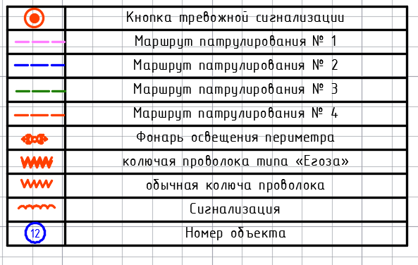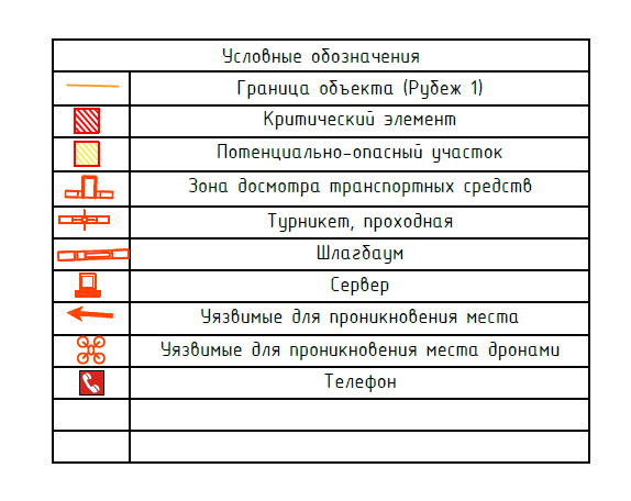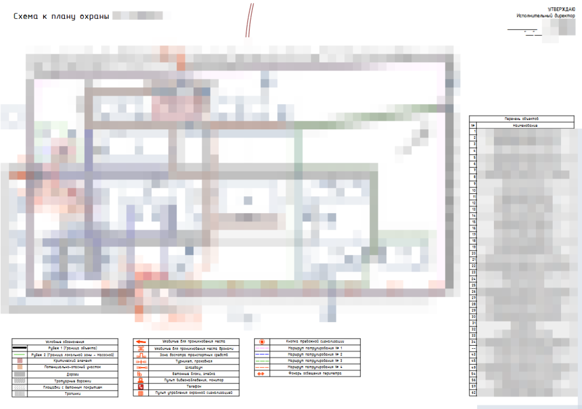 Графическая схема (план-схема) охраны: ситуационный план объекта с нанесенными элементами системы охраны, включая посты, КПП, инженерно-технические средства, критические элементы и потенциально опасные участки.