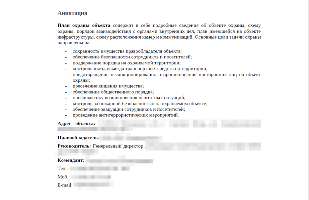 План охраны в обязательном порядке должен содержать информацию о выявленных угрозах безопасности объекта, возможных моделях нарушителей, описание уязвимых для проникновения потенциального нарушителя мест и т.д.