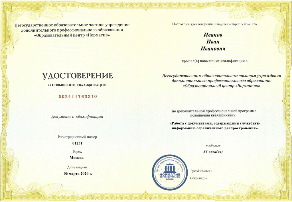 Учебный центр «Норматив» действует на основе образовательной лицензии № Л035-01255-50/00268150 от 10 декабря 2014 г. Выданные нами удостоверения о повышении квалификации имеют силу на всей территории Российской Федерации.
