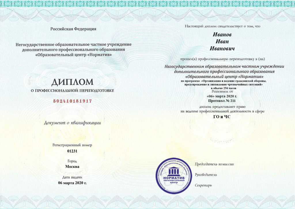 Учебный центр «Норматив» действует на основе образовательной лицензии № Л035-01255-50/00268150 от 10 декабря 2014 г. Выданные нами дипломы о профессиональной переподготовке имеют силу на всей территории Российской Федерации.