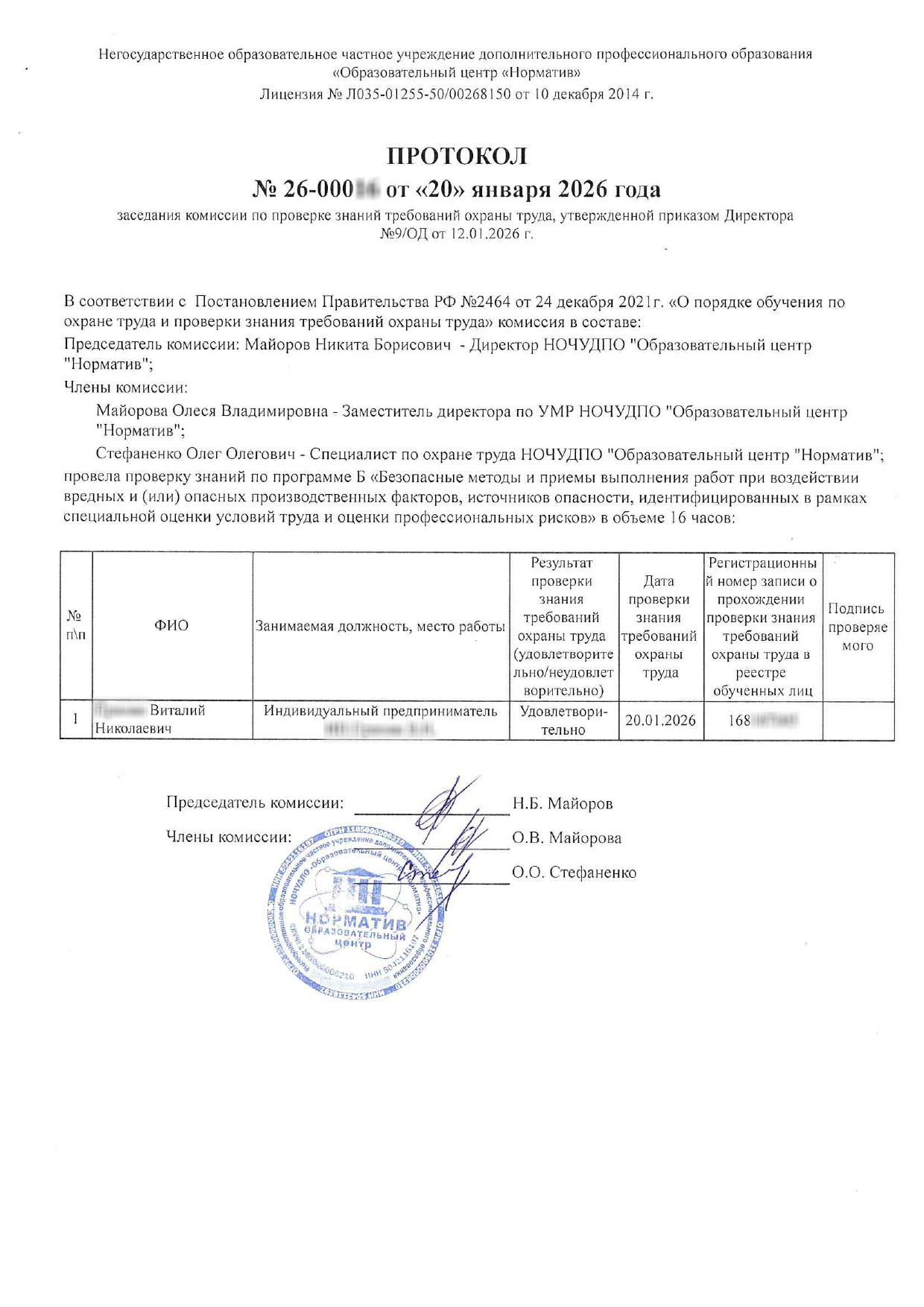Обучение завершается обязательной сдачей экзамена на портале. После успешного прохождения тестирования мы вносим ваши данные в реестр ЕИСОТ Минтруда, где каждому слушателю присваивается уникальный регистрационный номер. На основании этого оформляется и выдается протокол проверки знаний требований охраны труда с внесенным в него номером из реестра.