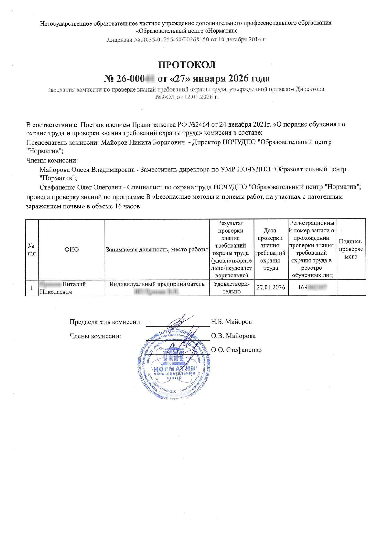 Учебный центр «Норматив» аккредитован Минтруда России на право обучения работодателей и работников вопросам охраны труда — номер записи в реестре № 2131, письмо от Минтруда России от 12.04.2023 № 15-4/В-3710. Действует на основе образовательной лицензии № Л035-01255-50/00268150 от 10 декабря 2014 г.