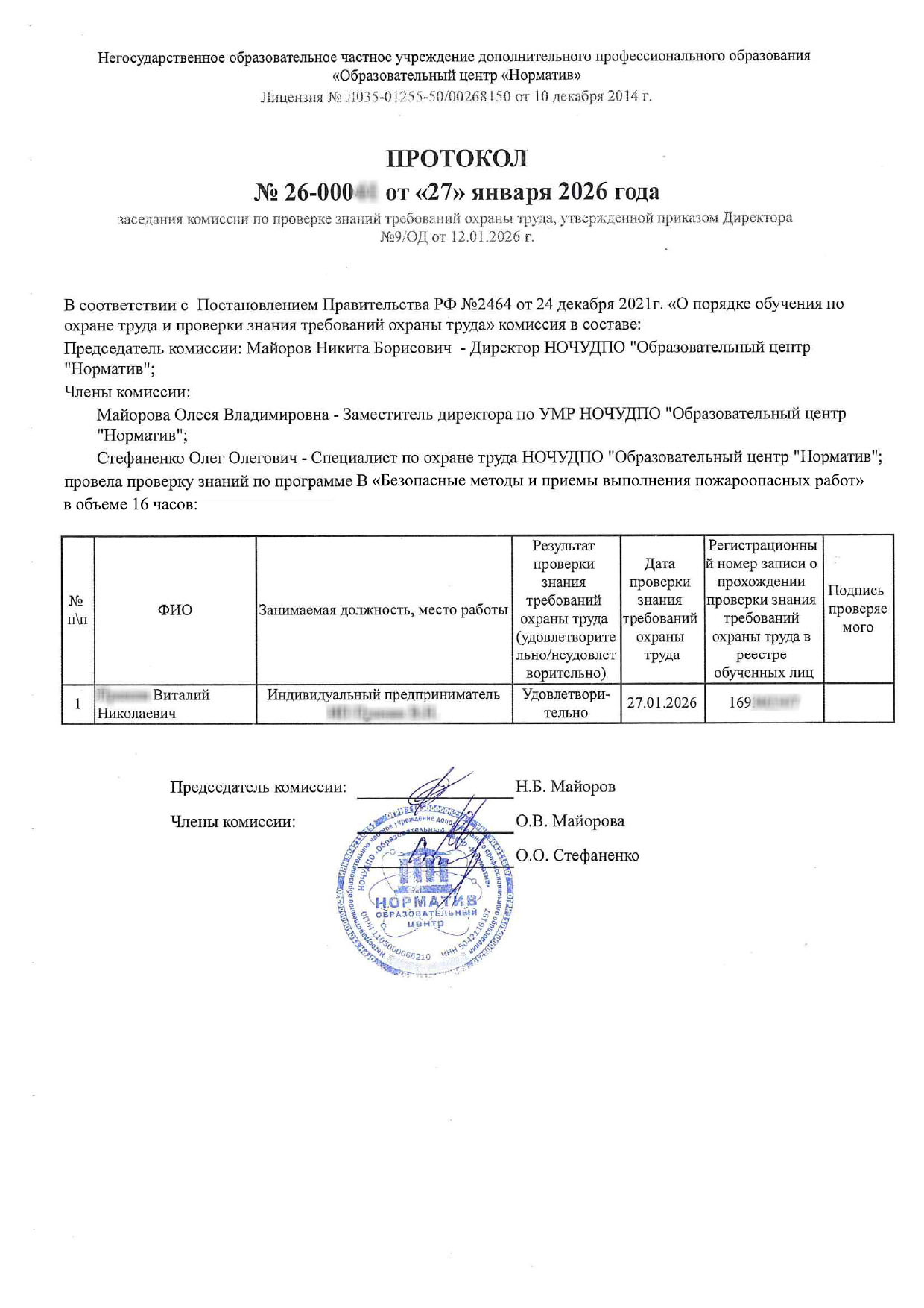 Учебный центр «Норматив» аккредитован Минтруда России на право обучения работодателей и работников вопросам охраны труда — номер записи в реестре № 2131, письмо от Минтруда России от 12.04.2023 № 15-4/В-3710. Действует на основе образовательной лицензии № Л035-01255-50/00268150 от 10 декабря 2014 г.