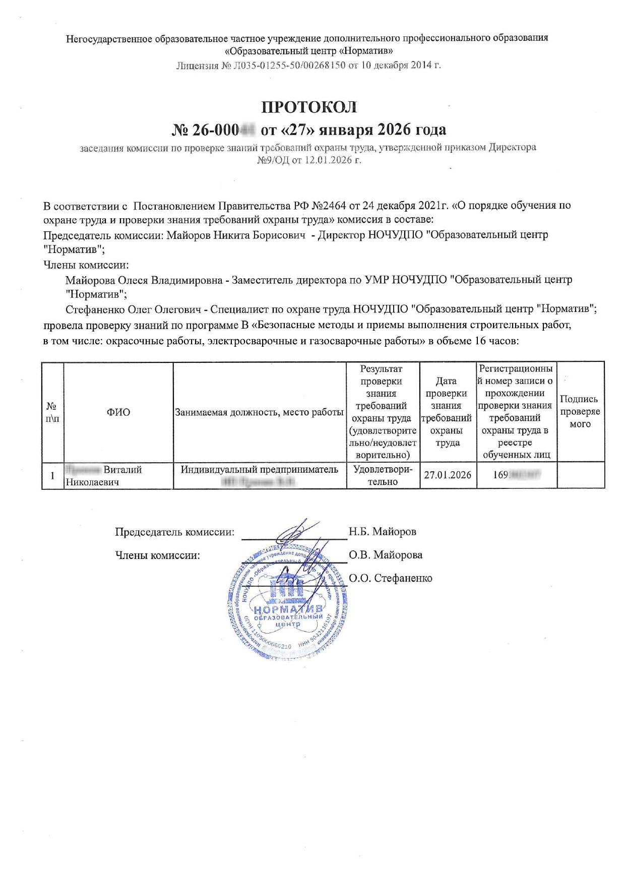 Учебный центр «Норматив» аккредитован Минтруда России на право обучения работодателей и работников вопросам охраны труда — номер записи в реестре № 2131, письмо от Минтруда России от 12.04.2023 № 15-4/В-3710. Действует на основе образовательной лицензии № Л035-01255-50/00268150 от 10 декабря 2014 г.