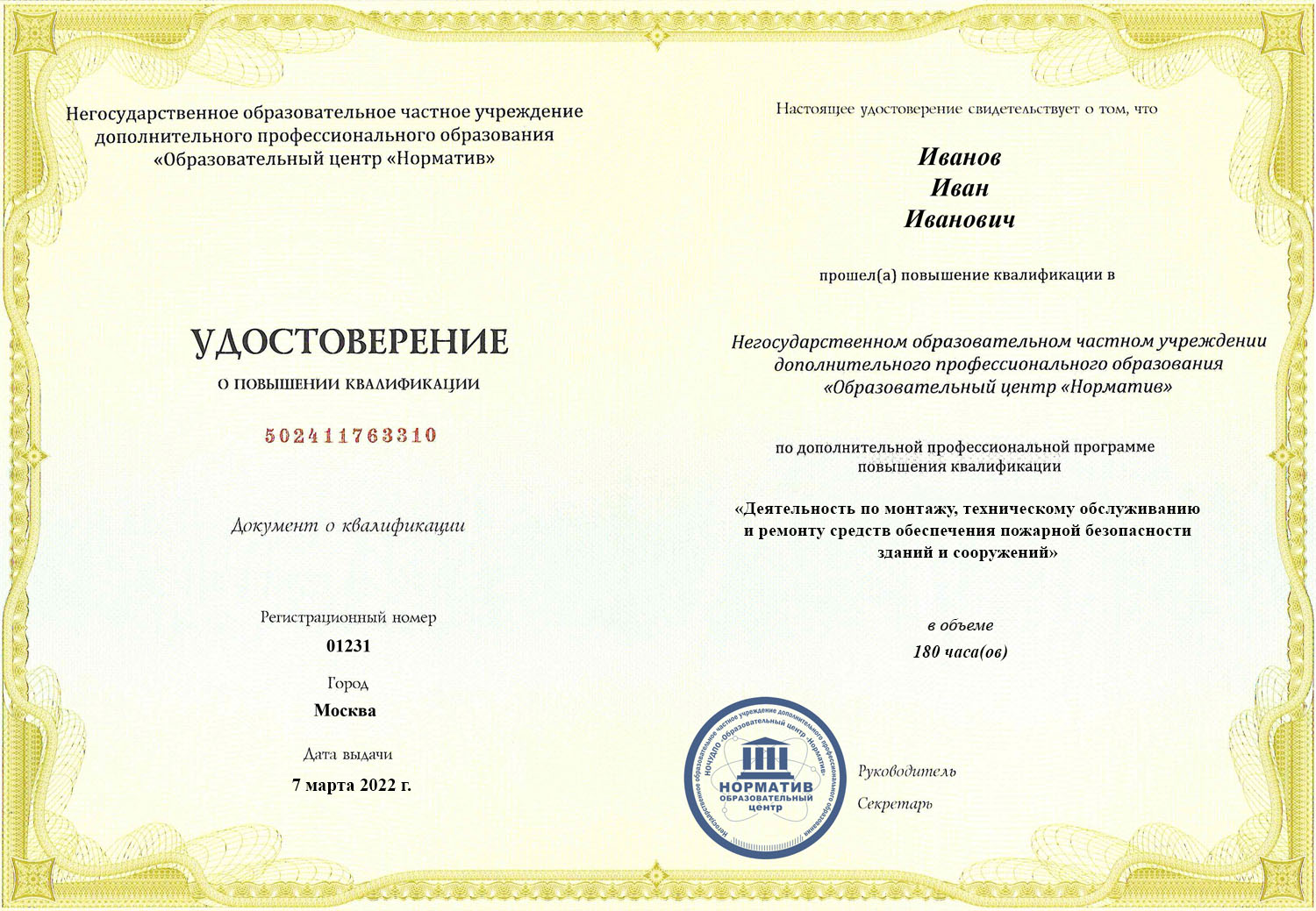 Учебный центр «Норматив» действует на основе образовательной лицензии № Л035-01255-50/00268150 от 10 декабря 2014 г. Выданные нами дипломы о профессиональной переподготовке имеют силу на всей территории Российской Федерации.