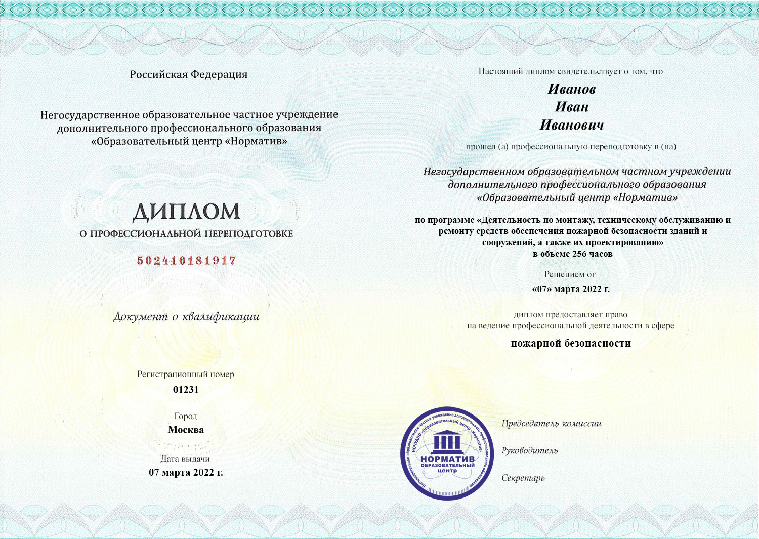 Учебный центр «Норматив» действует на основе образовательной лицензии № Л035-01255-50/00268150 от 10 декабря 2014 г. Выданные нами дипломы о профессиональной переподготовке имеют силу на всей территории Российской Федерации.
